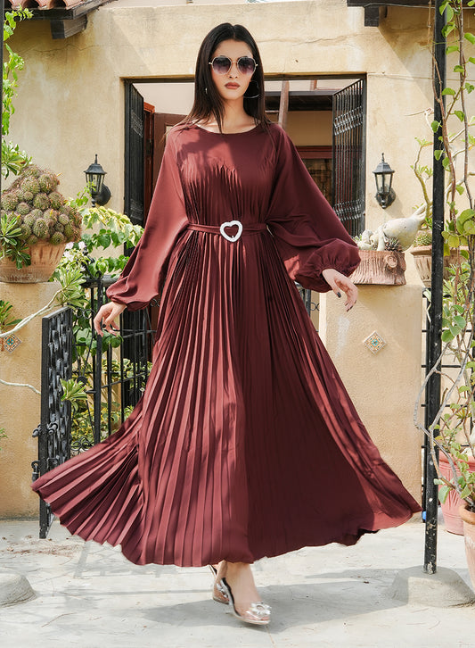 Maroon Pleated Kaftan with Heart-Shaped Embellished Belt