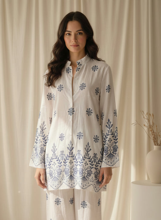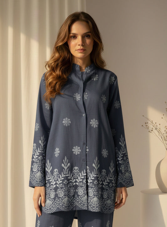 Embroidered Two-piece Shirt & Trouser (Brown)