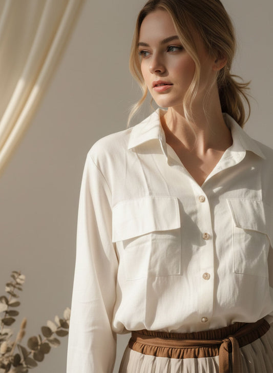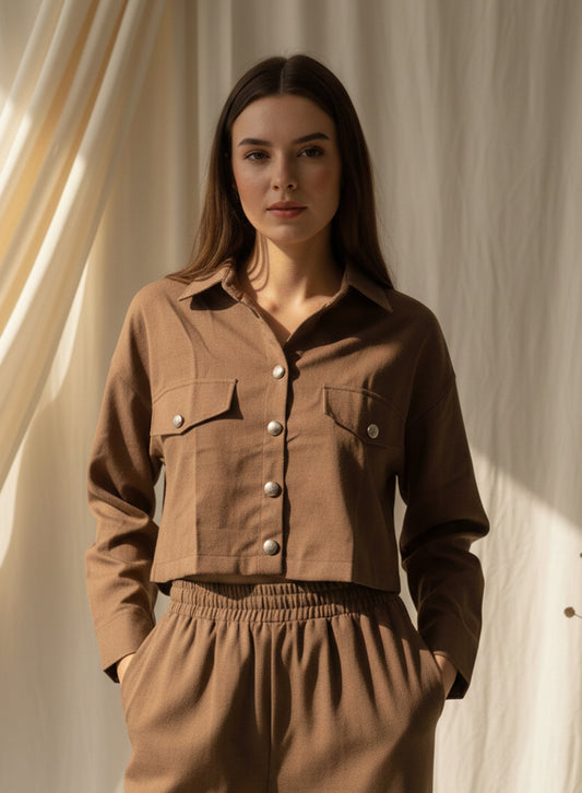 Two-Piece Tie Knot Shirt And High Waisted Trouser (Brown)