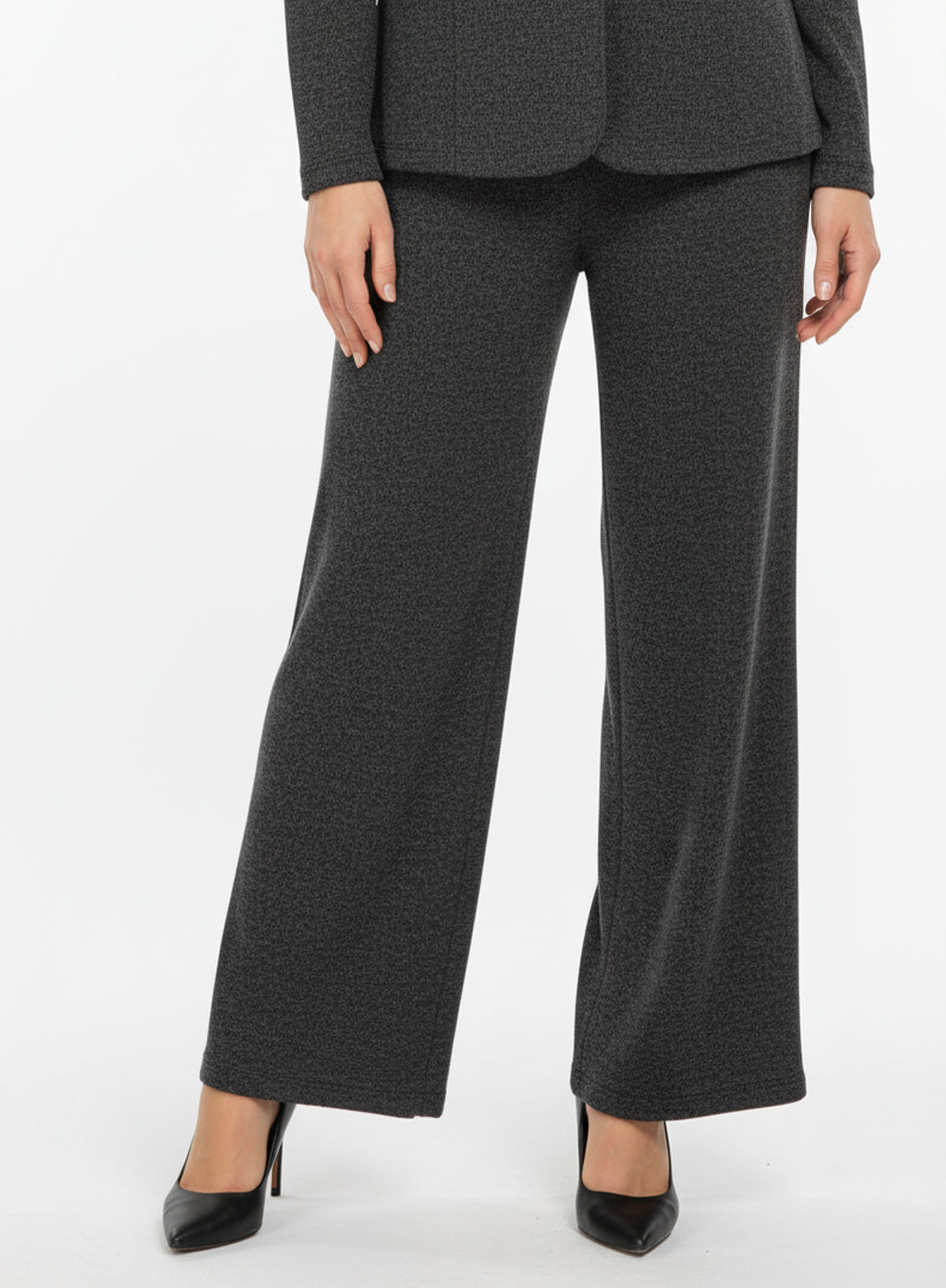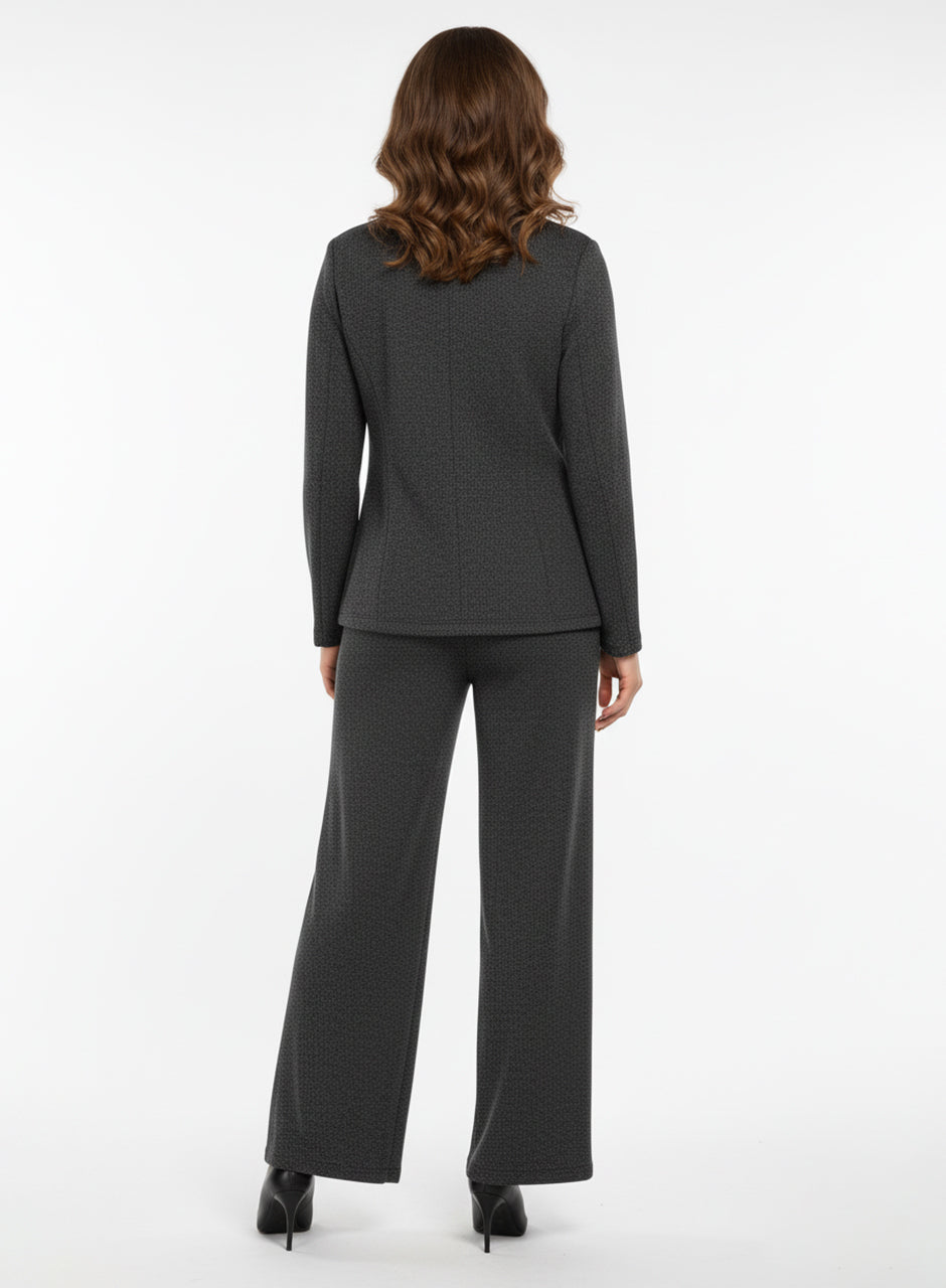 A polished and modern three-piece set designed for timeless versatility. This outfit features a structured long-sleeve blazer in a deep charcoal hue, fastened with a bold single button accent that adds a touch of refinement. The blazer is lined with a rich golden inner, creating a striking contrast that enhances its luxurious appeal, while a delicate un gold-toned brooch further elevates its sophisticated design. Paired with wide-leg trousers in the same textured fabric, the ensemble offers a clean, elongated silhouette.