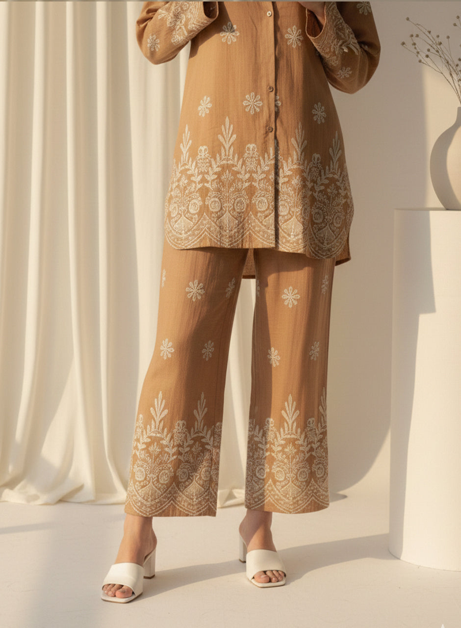 Embroidered Two-piece Shirt & Trouser (Brown)
