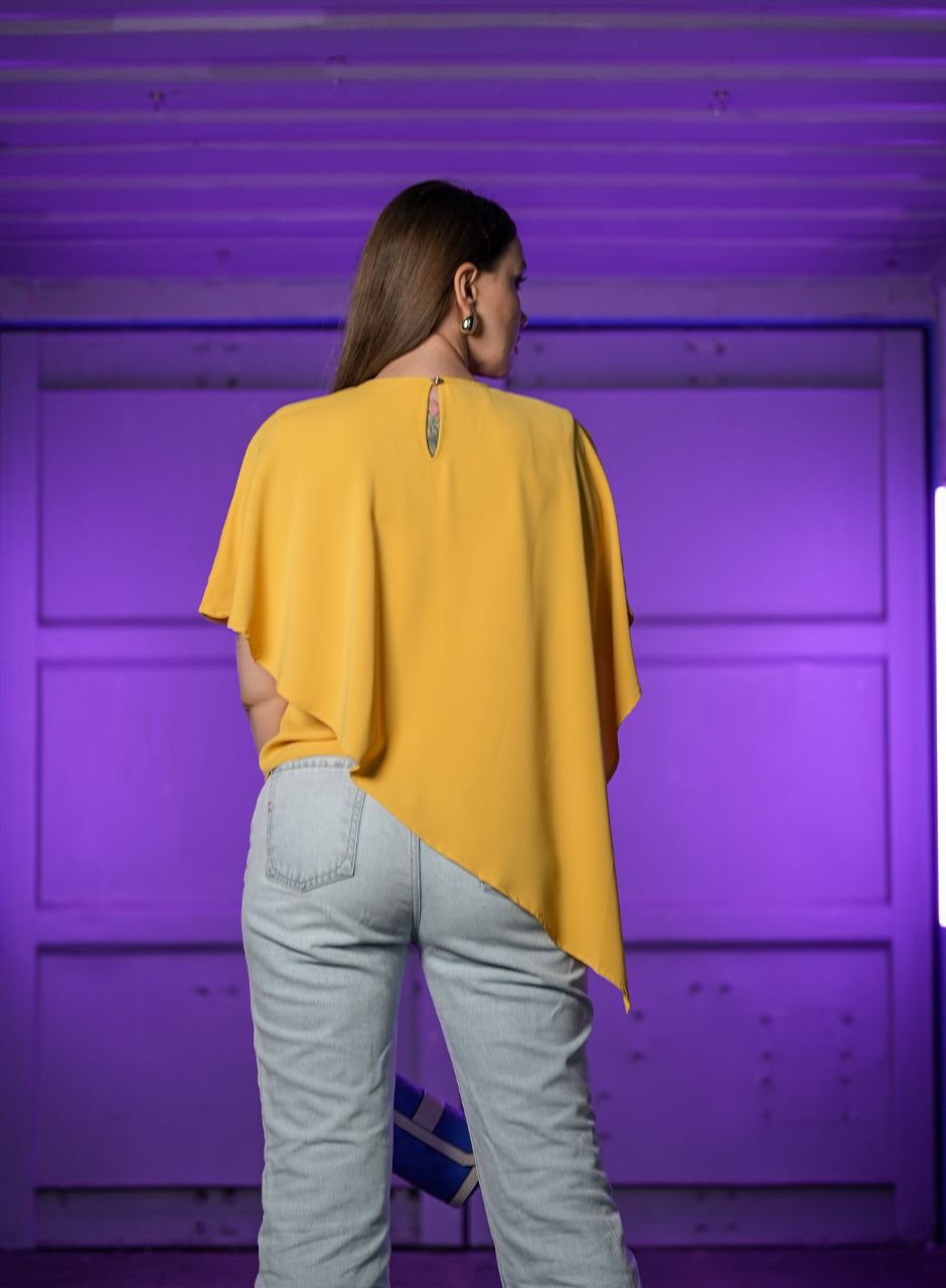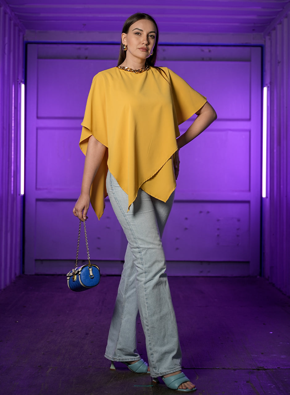 with denim for a chic casual ensemble, this mustard poncho-style top promises to