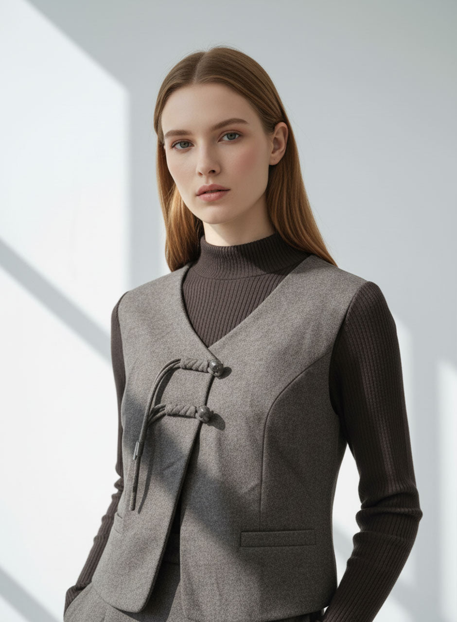 This sophisticated three-piece set features a vest and a skirt, perfect for creating a polished and coordinated look. The vest has a V-neckline and a distinctive, decorative front closure with toggle-like fasteners and a dangling drawstring detail. Its cropped, boxy fit is designed to be layered over a long-sleeved top, as shown in the images.